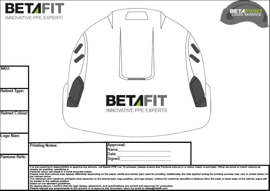 Getting your logo printed onto your Betafit helmet through our BetaPrint service ensures a high-quality, durable, and professional finish that enhances your brand’s visibility and team identity. We use advanced pad printing technology, which integrates seamlessly with the helmet’s surface, preventing peeling, fading, or damage from harsh environments. This method ensures long-lasting results, making it ideal for industries requiring robust PPE. With our precision printing, your logo will be crisp, clear, and compliant with safety standards. Additionally, we offer a streamlined and efficient service, ensuring your branded Betafit helmets are delivered quickly and reliably.